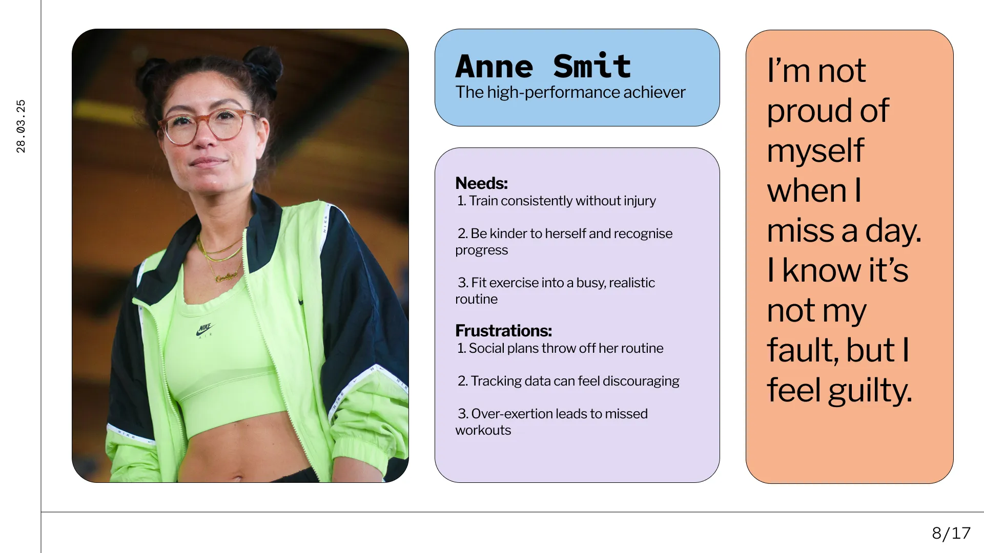 To ground our design in real user needs, we developed our primary persona, Anne Smit, a high-achiever struggling with workout guilt and injury. By centring our design around Anne’s pain points, we ensured that our solution addressed a clear and pressing need.