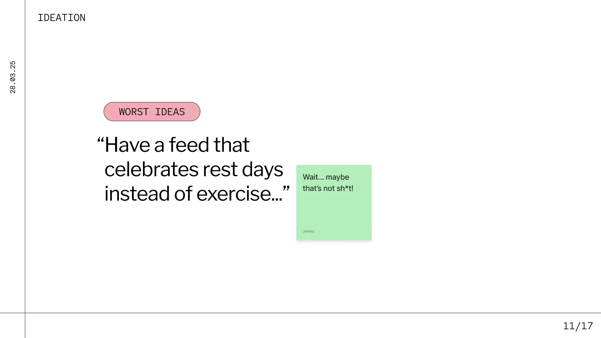 Despite gathering all those valuable insights, we initially struggled to break free from conventional fitness app structures. We found ourselves unconsciously replicating existing solutions rather than innovating. To shift our thinking, we conducted a ‘Worst Ideas’ exercise — brainstorming deliberately bad concepts to challenge our assumptions. The outcome of which you can see in the image above. This exercise helped us break free and explore new directions.